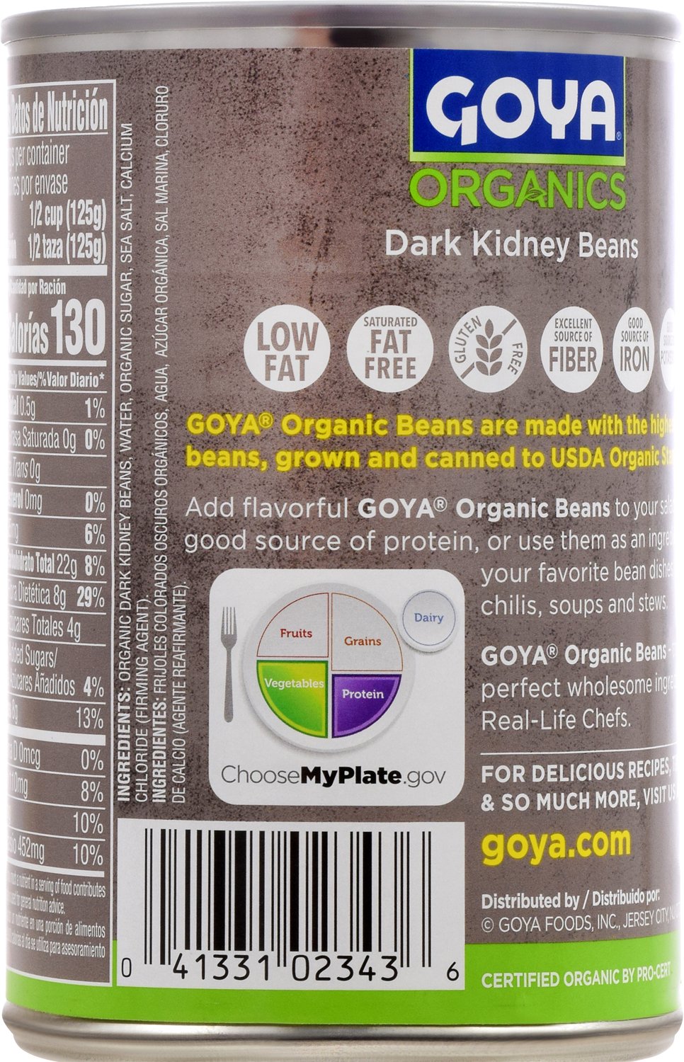 - CONVENIENT | GOYA Organic Dark Kidney Beans are a perfect fit for a busy lifestyle. Use the Easy Open Lid, then season, heat and serve. Enjoy them in stews, salads, and more plant-based delights