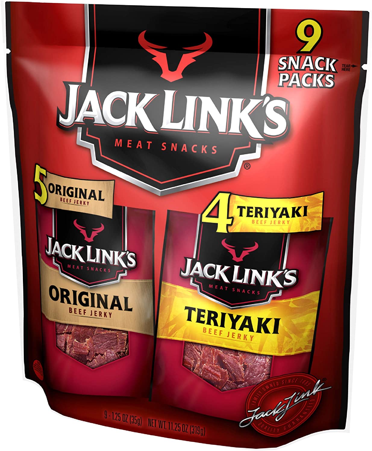 - GOOD SOURCE OF PROTEIN: Keeping your diet packed with protein helps keep you satisfied and energized all day, and it's never been easier to get protein than with Jack Link's beef jerky variety pack. Pack features 4 Teriyaki and 5 original 1.25 ounce bags.