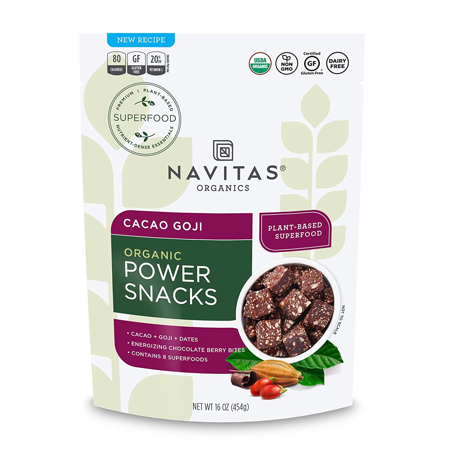 - Satisfyingly sweet, Navitas Organics Cacao Goji Power Snacks combine the antioxidant power of goji berries with mineral-rich cacao Provides eight superfoods and 20% DV vitamin C per serving!