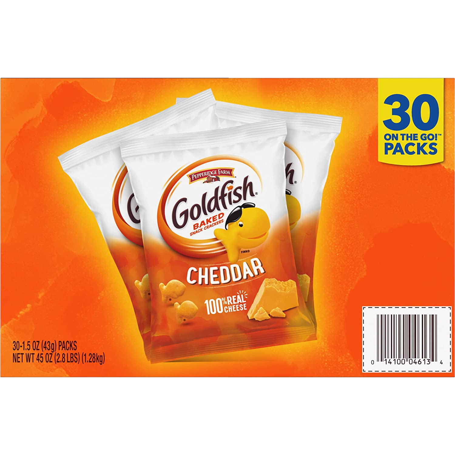 - 30 SNACK PACKS: 30-count multi-pack of Goldfish Crackers Cheddar snack bags